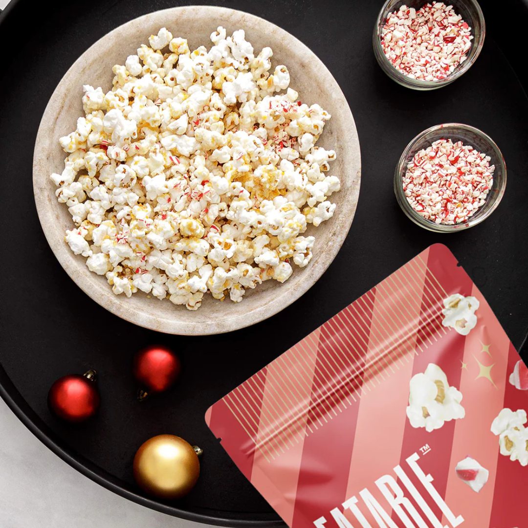 Belgian white chocolate covered kettle corn sprinkled with candy cane and peppermint-infused sugar crystals that literally POP in your mouth. A decadent treat for carefree mornings, and gatherings around the brunch table with your loved ones during the festive season.